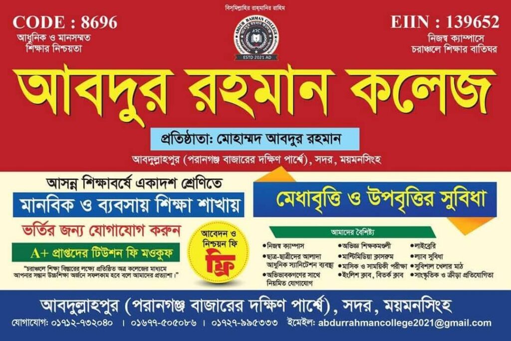 আবদুর রহমান কলেজ ময়মনসিংহ জেলার সদর উপজেলাধীন আবদুল্লাহপুর মৌজায় ২০২১ সালে প্রতিষ্ঠিত একটি বেসরকারি উচ্চ মাধ্যমিক কলেজ। ময়মনসিংহ সদর উপজেলাধীন ব্রহ্মপুত্র নদের উত্তর পাড়ের তুলনামূলকভাবে অনগ্রসর চরাঞ্চলের সীমিত আয়ের পরিবারের সন্তানদের উচ্চ শিক্ষার পথকে সুগম করার লক্ষ্যে কলেজটি প্রতিষ্ঠা করা হয়েছে। কলেজটির EIIN 139652 এবং College Code 8696। বর্তমানে অত্র কলেজে উচ্চ মাধ্যমিক পর্যায়ে মানবিক ও ব্যবসায় শিক্ষা শাখা চলমান রয়েছে। কলেজটির প্রথম ব্যাচের শিক্ষার্থীরা ২০২৫ সালে এইচ.এস.সি পাবলিক পরীক্ষায় অংশগ্রহণ করেছে।